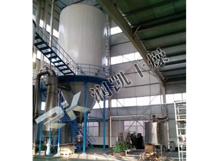 本機(jī)組工作過程為:料液通過隔膜泵高壓輸入,噴出霧狀液滴,然后同熱空氣并流下降,大部分粉粒由塔底排料口收集,廢氣及其微小粉末經(jīng)旋風(fēng)分離器分離,廢氣由抽風(fēng)機(jī)排出,粉末由設(shè)在旋風(fēng)分離器下的收粉筒收集,風(fēng)機(jī)出口處還可裝備二級(jí)除塵裝置,回收率在96%-98%。