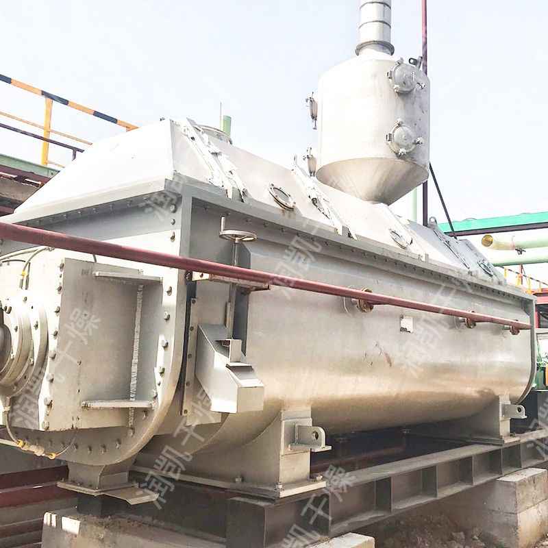 空心軸上密集排列著楔型中空漿葉,熱介質(zhì)經(jīng)空心軸流經(jīng)漿葉。單位有效容積內(nèi)傳熱面積很大,熱介質(zhì)溫度從40℃到320℃,可以是水蒸汽,也可以是熱水或?qū)嵊偷取鳠峤橘|(zhì)通過旋轉(zhuǎn)接頭,流經(jīng)殼體夾套及空心攪拌軸,空心攪拌軸依據(jù)熱介質(zhì)的類型而具有不同的內(nèi)部結(jié)構(gòu),以保證^佳的傳熱效果。 在漿葉及夾套通入蒸汽加熱的同時(shí),出料口上部同時(shí)通入經(jīng)過加熱后的干空氣進(jìn)一步干燥,這樣大大增加了設(shè)備的干燥強(qiáng)度。蒸發(fā)出來的水分由尾氣帶出干燥機(jī),經(jīng)過布袋除塵器過濾,將干燥后的細(xì)粉回收下來,濕空氣由水除塵后引風(fēng)機(jī)排出室外。