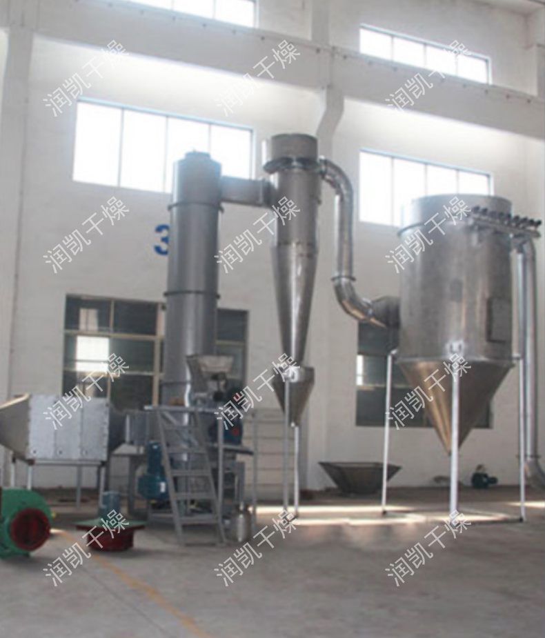 熱空氣由入口管以適宜的噴動(dòng)速度從干燥機(jī)底部進(jìn)入攪拌粉碎干燥室,對(duì)物料產(chǎn)生強(qiáng)烈的剪切、吹浮、旋轉(zhuǎn)作用,于是物料受到離心、剪切、碰撞摩擦而被微?;?,強(qiáng)化了傳質(zhì)傳熱。